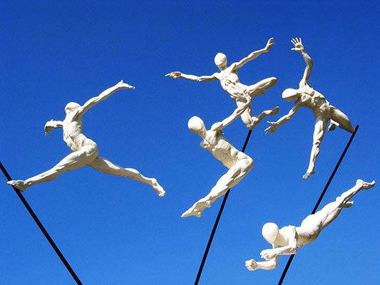 One is a cool and measured response to a profound sense of unrest. In this work, figures fly in defiance or are challenged by their environments. They ‘trippingly’ negotiate upheaval or uncertainties — each work is a balancing act, a metaphor for a precarious state of living or existence. Androgynous and anonymous human figures tilt and fall away – on and off objects that also teeter on a chaotic or shifting stage. Figures may be set free against strongly convergent lines, shapes and forms.