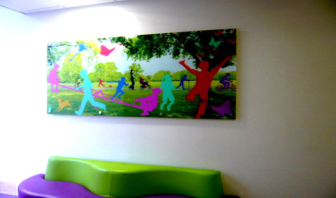 The Portland Hospital wanted to create a welcoming and bright atmosphere in the primary areas of the hospital using artworks that were created through photo-montage technique. The artworks, designed by one of our artists, were digitised montages of photographs taken by the artist of landmarks around Great Portland Street and Regents Park which were then mounted onto glass or perspex panels.